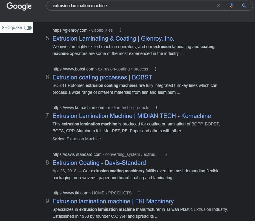 透過 Google 搜尋先行了解這個關鍵字的搜尋結果中的競爭對手有誰,如果都是與自身產品相關的同業品牌,那就代表關鍵字是大致相符合的,相反地,如果發現搜尋結果的網站都與自家產品無關,那可能就必須審慎評估避免挑錯戰場。以 Lamination Machine 的搜尋結果來看,大多是 B2C 的商城,如:Amazon 亞馬遜電商平台。而 Extrusion Lamination Machine 則是出現較相關的品牌,較為適合執行。